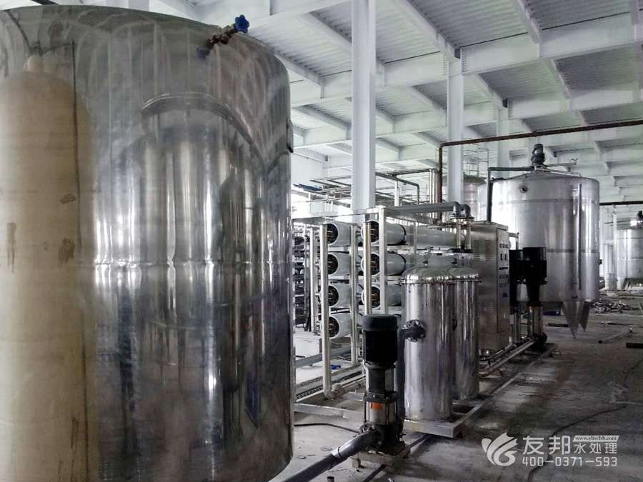 原水→原水加壓泵→多介質過濾器→活性炭過濾器→加藥裝置→精密過濾器→第一級反滲透 →PH調節→中間水箱→第二級反滲透(反滲透膜表面帶正電荷)→純化水箱→純水泵→陰陽樹脂混床→微孔過濾器→用水點