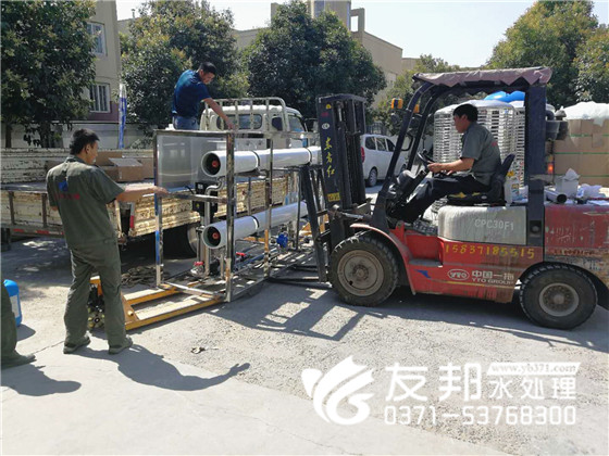這套型號為YB-CJS-005,每小時出水5噸的單級水處理設(shè)備是發(fā)往新鄉(xiāng)的,工人們冒著炎炎夏日正在裝車發(fā)貨。