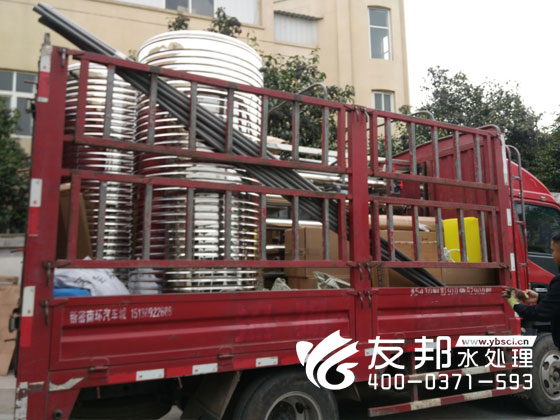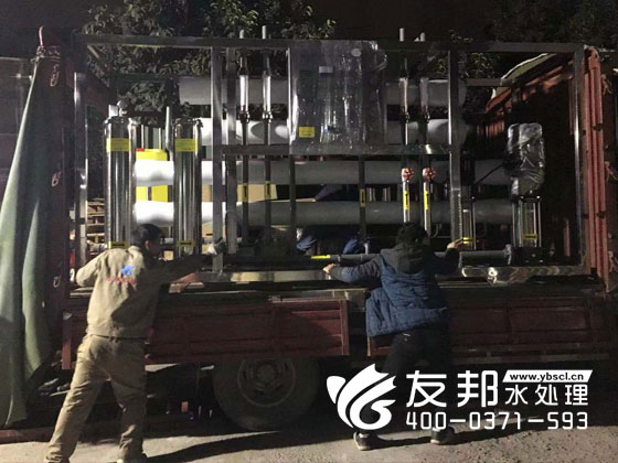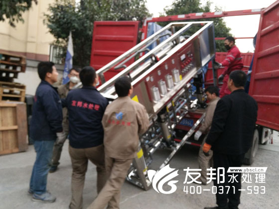師傅們正在裝車(chē)發(fā)貨的是鄭州友邦生產(chǎn)的型號(hào)為YB-CJS-002的2噸純凈水設(shè)備。這套設(shè)備是用在鄭州高新區(qū)機(jī)械廠的生產(chǎn)用水。